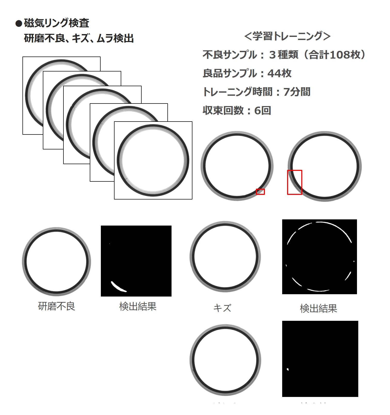 図2の磁気リング検査事例では、良品サンプル44枚、不良サンプル(3種類)108枚の画像を用いて、収束回数6回※1、学習時間7分で実施した例です。結果画像では、研磨不良やキズの箇所を画素単位で検出しています。
