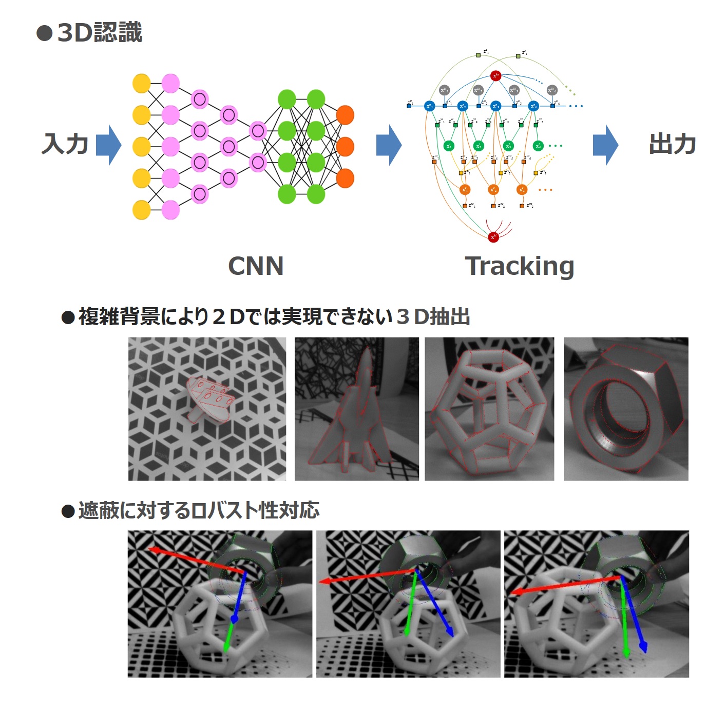 3D認識「3DNet」では、3D情報を基に対象物の姿勢を検出します。用途としては、ロボットピッキングや障害物検知など、2Dでは誤認識するようなケースでも、3D情報を活かし、物体の姿勢を高精度に検出します。技術的には、CADモデルまたは、実写画像サンプルから生成した3Dモデルを使用し、高速な3Dマッチングとトラッキング技術の組み合わせで構成されます。