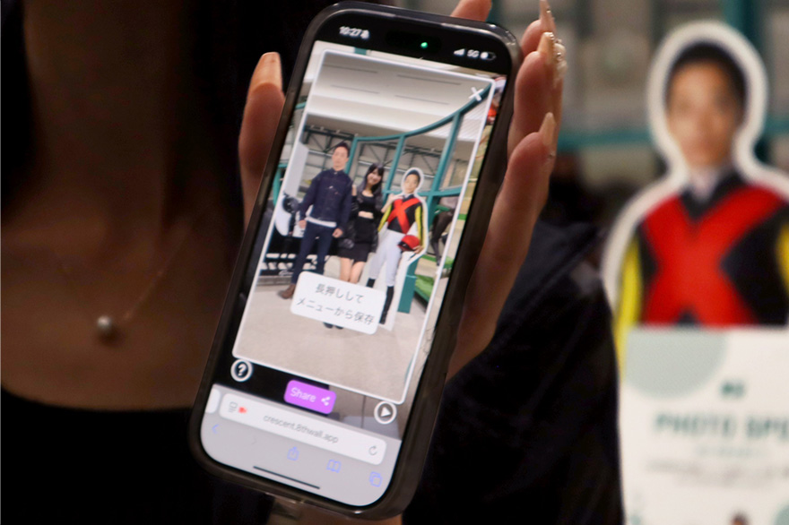会場で配布されているパンフレットの最後のページにあるQRコードをスマートフォンで読み込むと、ARの川田騎手が登場!スマホに映し出したAR騎手と、会場にある等身大パネルの間に立って撮影すれば、まさに“両手に将雅”という贅沢な一枚が完成します。