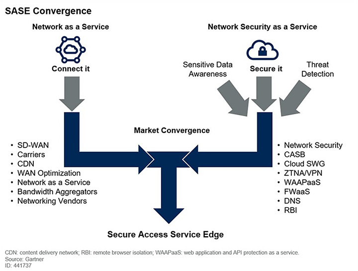 SASEは、米国のIT調査会社Gartner(ガートナー)が2019年に提唱した概念で、以下2つの要素群で構成されます。