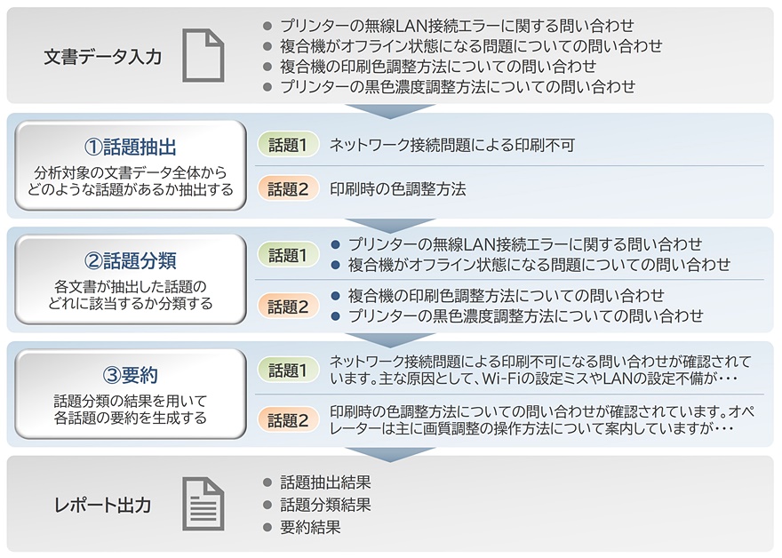 そこでこのフェーズでは、生成AIに問い合わせと対応の細部まで把握してもらうために、文書全体をそのまま生成AIに入力しています。この手法により、印刷不可になる原因など、話題に関して意義のある情報が要約結果に反映されるようになりました。