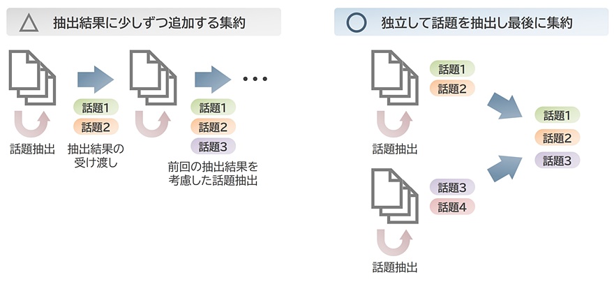 当初は「前回の抽出結果に少しずつ追加していく」という集約方法を試しましたが、この方法では同じ話題が何度も重複して出力されるなど、話題抽出結果が不安定になることが判明しました。そこで集約方法を変更し、「データバッチごとに独立して話題を抽出」して最後に一括で集約する方法を採用したところ、出力の安定性が向上しました。