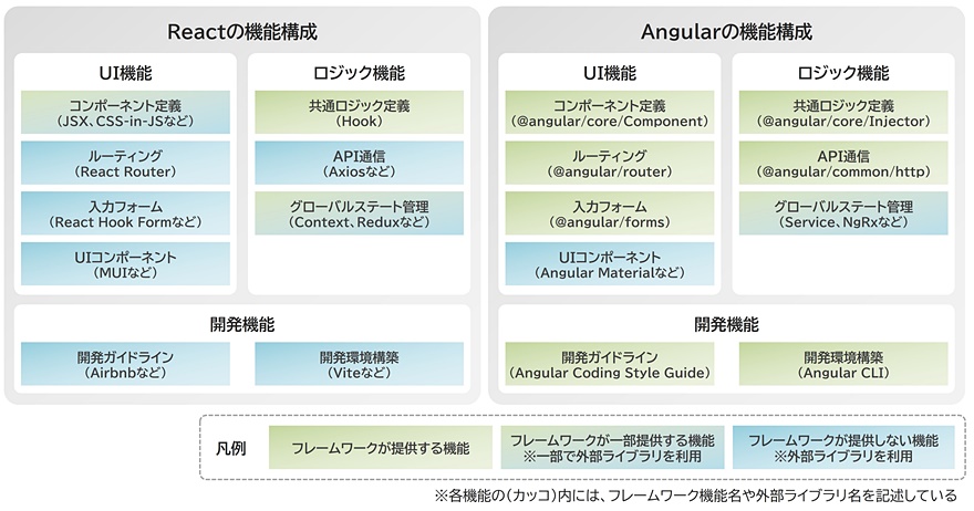SPAを実装するために必要な機能について、ReactとAngularがどのような機能を備えているかを図3にまとめました。