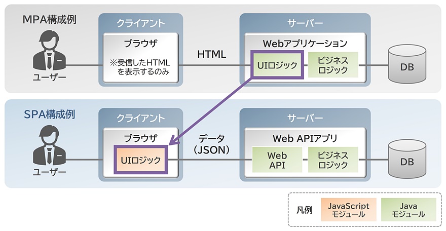 近年、ユーザーの操作性を向上させる手法として、SPA(Single Page Application)の導入が広がっています。図1には、従来のMPA(Multi Page Application)とSPAの構成例を示しています。SPAでは、プログラムがユーザーの手元に近いブラウザー上で動作するため、ユーザー操作への反応が従来に比べて速くなります。