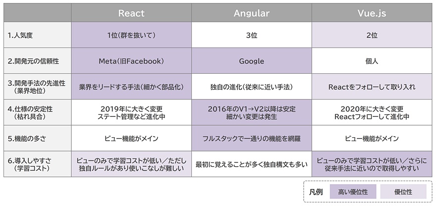 トレンド調査サイト(State of JavaScript)によると、現在人気のあるJavaScriptフレームワークは、React※、Angular、Vue.jsです。それぞれの大まかな特長を図2にまとめています。