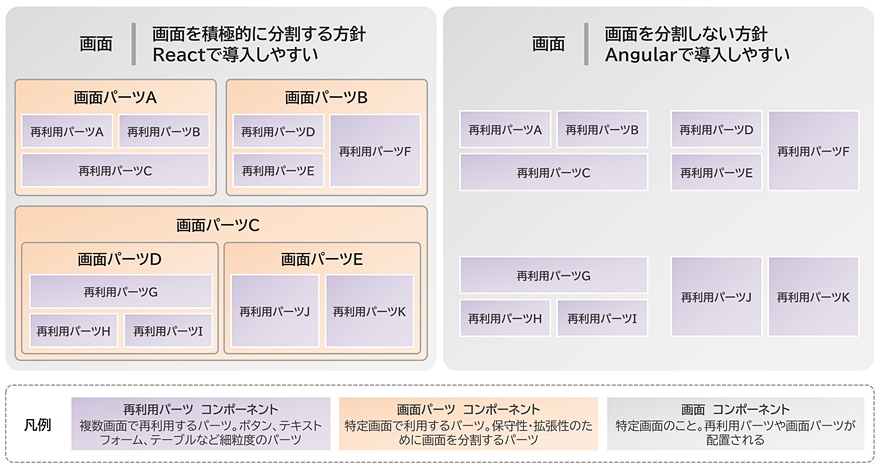図4の右側は、画面全体を1つの大きなコンポーネントとして構築する設計方針です。従来よく採用されてきた手法であり、Angularで導入しやすい※2です。この方針は、画面の内部設計コストを軽減し、開発作業を容易に進められます。一方、複雑な画面ではコードが肥大化しやすく、保守性が低下する可能性があります。この方針の利用ケースとしては、多数のメンバーが関わり、比較的シンプルな画面を量産する社内システム開発に適しています。