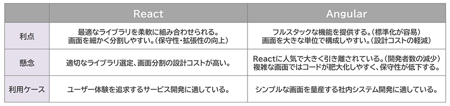 ここまで説明したReactとAngularの特長を表1にまとめました。