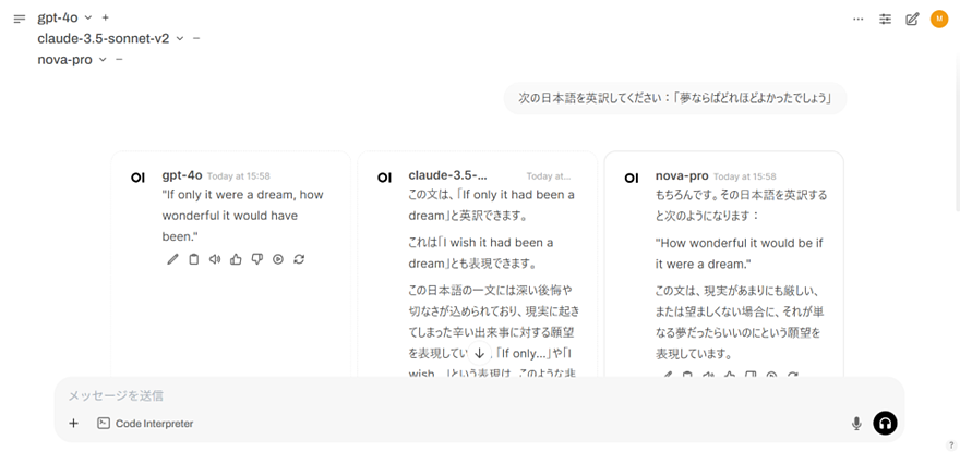 下の図ではOpen WebUIを用いて、OpenAI GPT‑4o、Anthropic Claude 3.5 Sonnet、Amazon Nova Proに同一のプロンプトを与えた場合の出力を比較しています。