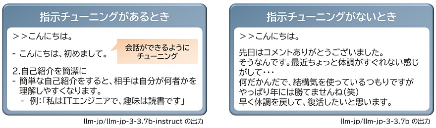 図2に会話ができるように指示チューニングした例を示します。指示チューニングがあるとき、「こんにちは」の入力に対して「会話として呼びかけられた」と解釈し、その続きを「こんにちは、初めまして」と推測しています。一方で、指示チューニングをしていない場合は、同じように「こんにちは」と入力しても、会話ではなく、単純に言葉の続きとして推測して生成します。どちらも生成AIの基本原則である「次の語を推測する」に従っています。指示チューニングの有無で、その出力に変化があることがわかるでしょう。
