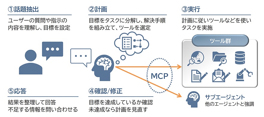 AIエージェントとは、ユーザーの指示を理解して、自律的に目標を設定し、目標達成に向けた計画を立て、推論やツールの呼び出しなど多様なタスクを遂行することで課題を解決する大規模言語モデルを基盤としたシステムです。AIエージェントは、ユーザーの指示を受けると、理解、計画、実行、確認/修正、応答という5つのステップを繰り返して課題を解決します(図1)。