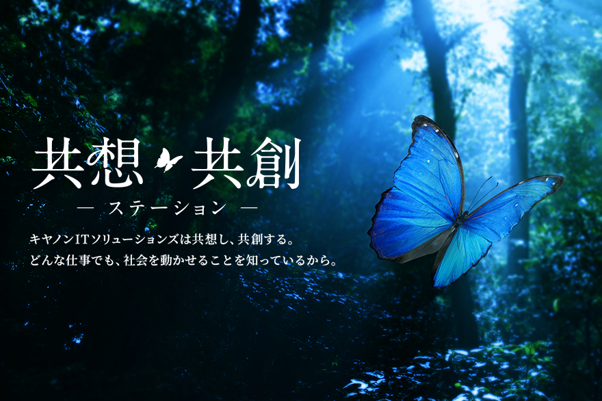 「共想共創ステーション」は、お客さまやパートナー企業の皆さんとの共想共創を通じてお客さまの経営課題の解決につなげること、社会課題の解決に貢献していくことを、小さな変化が時間の経過と共に大きな変化になることを意味する「Butterfly Effect※」とリンクさせ、蝶をモチーフとしたデザインをキービジュアルにしています。その蝶がキヤノンITSグループのさまざまな取り組みを紹介し、やがてさまざまな想いを持つ蝶が集まり新しいことを生み出していきたいという想いを表現しました。