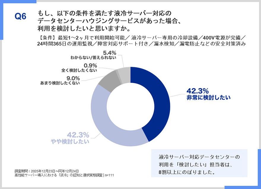 液冷サーバー対応データセンターの利用を「検討したい」担当者は、8割以上という結果でした。