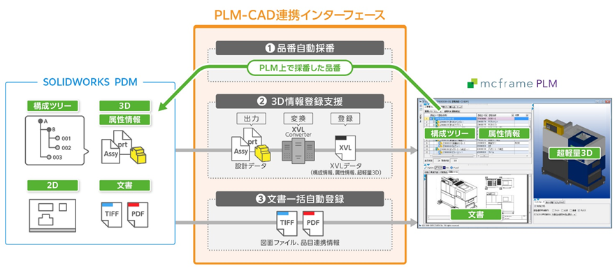 - PLM-CAD連携インターフェースは、製品ライフサイクル管理「mcframe PLM」とCADソフトウェア「SOLIDWORKS」間の連携をシームレスに行える、①品番自動採番、②3D情報登録支援、③文書一括自動登録の3機能を包括したインターフェースです。従来は手動で行っていた設計成果物の登録および品番の反映をシームレスにすることで、作業負荷の低減やヒューマンエラーの防止を実現します。