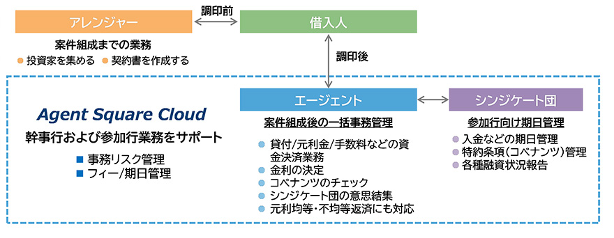 2005年から金融機関向けに提供しているシンジケートローン業務管理ソリューション「Agent Square」は、市場の変化やお客さまからの要望に柔軟に対応し、随時機能改修を加えながらお客さまの業務に沿ったシステムへと成長してきました。今後も利便性を高める機能拡張や他のサービス/システムとの連携強化を継続的に行いながら、エージェント業務に取り組む金融機関を支援してまいります。