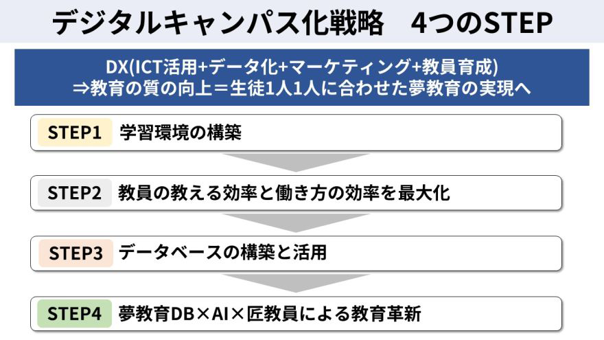 藤井:これからSTEP3の「データベースの構築と活用」ということで、生徒の生活や学習の履歴、面談の記録や指導内容といった教育データをどんどんシステムに蓄積し、それらを深く分析して「夢教育」に活用するフェーズに入っていきたいと考えています。中学も高校も、3年ごとに生徒が入れ替わっていくので、最低3年分のデータが蓄積できれば、指導内容と生徒の成長の相関などを分析できるようになります。