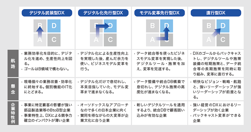 自社のビジョン(想い)・戦略や、それを取り巻く事業環境・企業風土などの条件をふまえつつ、以上の4つの航路「デジタル武装型DX」「デジタル化先行型DX」「モデル変革先行型DX」「直行型DX」のいずれに自社が該当するのか、まず見定めることをお勧めしたい。
