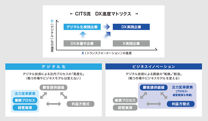 一方、X軸方向の進展(ビジネスイノベーション)は、「顧客提供価値」「利益方程式」に注力して変革を進めていくことに対応する。むろん、「顧客提供価値」「利益方程式」を変革する際には、既存の「業務プロセス」「経営資源」についても手を付けることが必要になってくる。