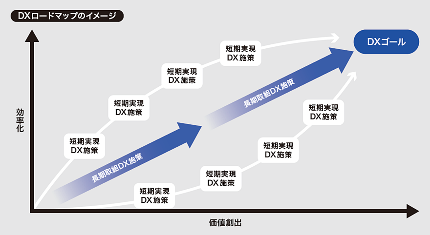 ここで言う「長期取組施策」とは、統合データベースの構築など、いったん決定・実施するとその後長期にわたって当該企業のDX推進の枠組みを規定してしまう施策である。要する費用・労力も多大なものになる場合が多い。したがって、当然ながら、その施策の検討・決定は慎重に進めなければならない。また、ロードマップ上では、DXのゴールに向かう道筋の背骨として表現されるような中心的施策になる。
