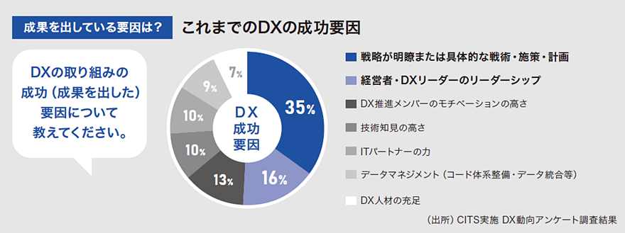次に、「DXの取り組みの成功要因、成果を出した要因」を尋ねたところ、最も多い回答が「戦略が明瞭、または具体的な戦術・施策・計画」であり、「経営者、DXリーダーのリーダーシップ」が続いた(図3)。この結果からは、「明確な戦略と強いリーダーシップ」を伴っている企業のDXが成果を出していることが見て取れる。