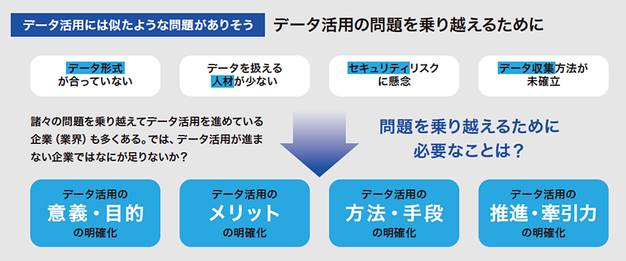 たとえば医療業界では、病院内での「電子カルテ」の導入など、徐々にデジタル化が進んでいるが、データの活用となると様々な問題がある。医療機関の中でも「各部門のデータの形式が合っていないので連携できない」「溜まったデータを分析する人材がいない」「患者のデータを扱うためにはデータ漏洩のリスクが懸念」「地域の公共機関や医療機関と連携するにもデータ収集方法が未確立」など、データ活用に向けてさまざまな問題点が存在している。また、教育業界、例えば大学などの教育機関でも、「データ形式問題」「人材問題」「セキュリティリスク」「データの収集問題」など、同様の障壁、問題が存在している。これまでの通り、データ活用が進んでいない業界では「データ形式が合っていない」、「データを扱える人材が少ない」、「セキュリティリスクに懸念」、「データ収集方法が未確立」といった共通の、類似問題があるが、一方でデータ活用を進めている企業、業界では、これらの問題を乗り越えてデータ活用を進めている。