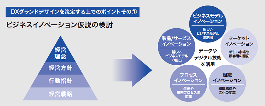まずは、DXグランドデザインを策定する上で留意しておきたいポイントを3点挙げる。1点目はビジネスイノベーション仮説の検討である(図7)。企業の経営理念、経営方針、行動指針、経営戦略に則り、データやデジタル技術を活用して、「なにを」イノベーションすべきか、この仮説を立てることが重要である。ビジネスイノベーションとは、新しいアイデア、製品、サービス、プロセス、ビジネスモデルを導入して、それによって市場や業界に変革をもたらし、競争優位性を確立することを指す。ビジネスイノベーションは企業の成長と持続可能性を促進し、新たな収益源を創出するために重要である。ビジネスイノベーションの仮説検討では、創造性、柔軟性、リスクテイクの精神が求められる。