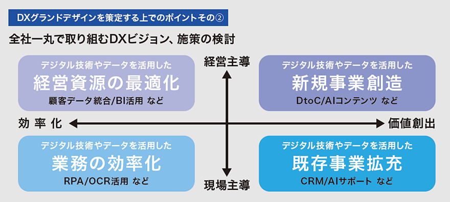 2点目のポイントは、全社一丸で取り組むDXビジョン、施策の検討である(図8)。基本的にDXビジョンは経営視点で策定することが定石であるが、一方でDXの推進は現場の実務担当者の協力が欠かせない。経営視点で策定するDXビジョンはどうしても視座が高くなってしまうため、そのままDX施策に落とすと、現場の実務担当者が抱えている課題感とは乖離が生まれてしまい、結果としてDXの戦略は総論賛成・各論反対に陥ることが多い。つまり、経営のみならず、現場の実務担当者にとってもDXの必要性が理解され、浸透するようなDX戦略が必要である。そのためには、「経営主導と現場主導」「効率化と価値創出」の両軸の2項対立をバランスよく共存させるDX戦略が理想である。