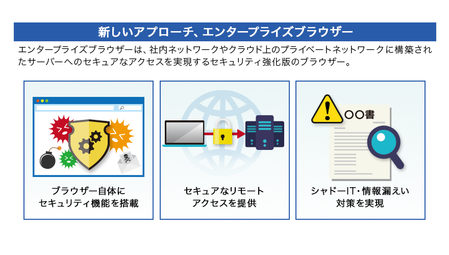 私たちの業務はSaaSやその他のクラウドサービスの利用など、ブラウザー上で完結できるものが少なくありません。アクセスや制御の起点がブラウザーに集約されるのであれば、ブラウザー自体をセキュリティの境界として機能させるアプローチが有効です。こうした考えを背景に、アクセス制御やDLPなどといった通常のブラウザーにはないセキュリティ機能を備えた「エンタープライズブラウザー」が登場しています。