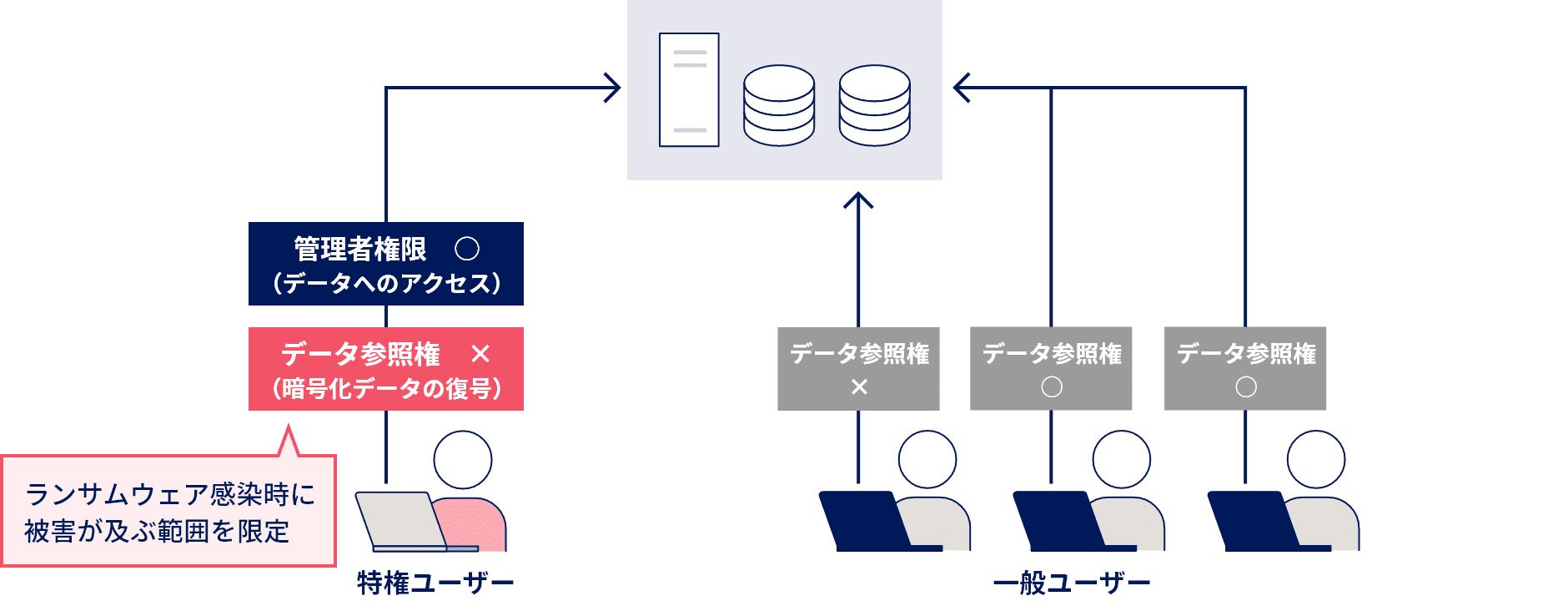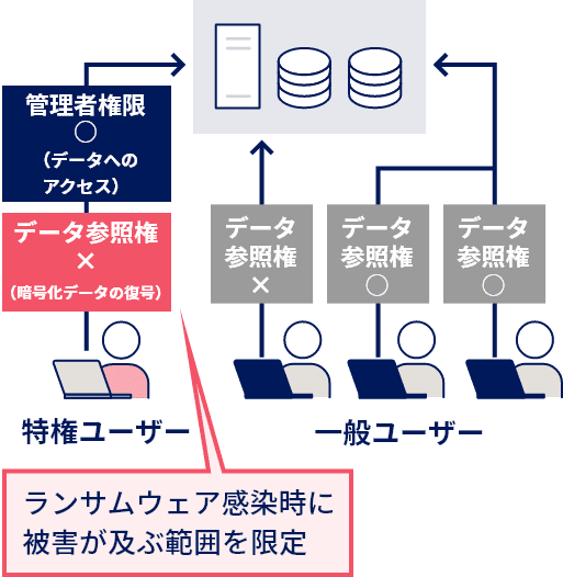 - ランサムウェアの攻撃で狙われがちな特権ユーザーについて、データへのアクセス権と参照権(復号の可否)を分離させることで、ランサムウェアによる不正なデータ暗号化の被害を抑制できます。