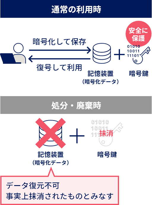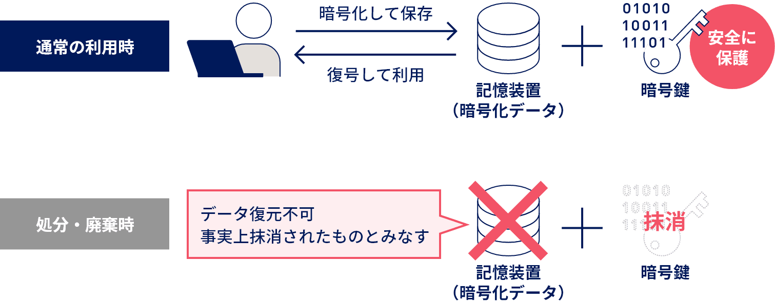 - 暗号化に用いた暗号鍵を抹消すると、データの復元は不可能になります。この仕組みを利用した「暗号化消去」は、HDDやSSDを処分する場合やクラウド上のデータを消去する場合に、高速かつ柔軟にデータを消去する手段として、多くのセキュリティガイドラインで認められています。