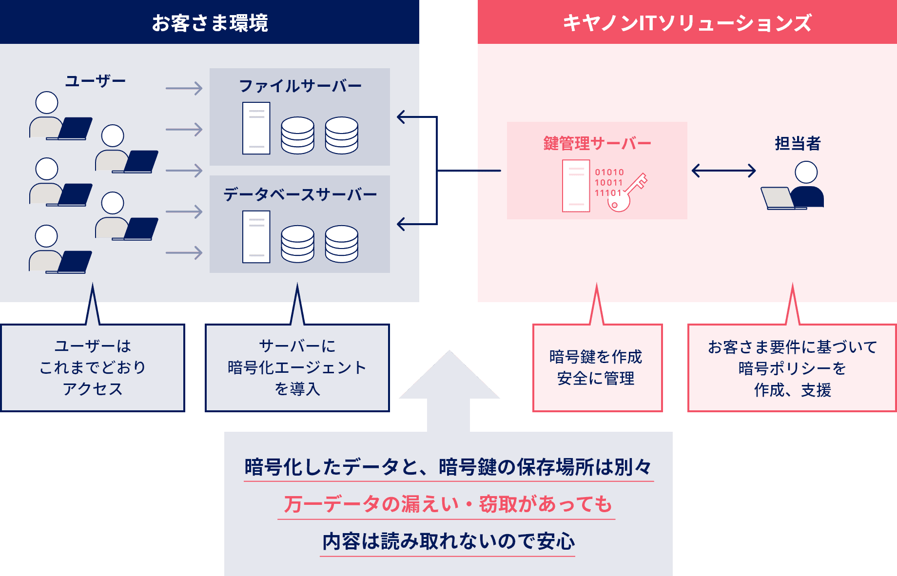 ハイレベル- 暗号鍵の作成、管理はキヤノンITソリューションズが実施。鍵管理専用のサーバーで、安全・適切に保護します。