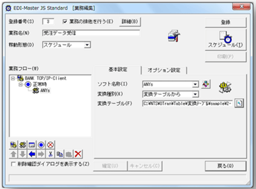 EDI-Masterシリーズ各ソフトによる個々の処理を一連の“業務”(あるデータを通信ソフトで受信した後、トランスレータで変換する、など)ごとに登録し、年月日等スケジュールを指定して実行できます。もちろん手動実行(実行したい業務を選択し即時実行する)も可能です。