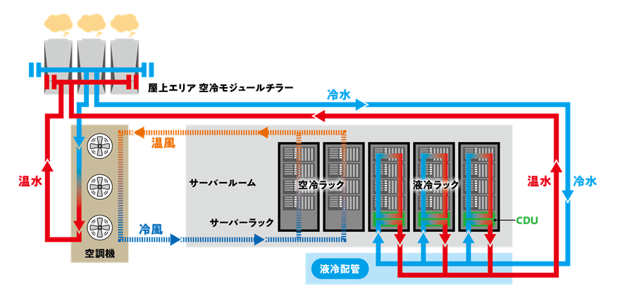 - 大容量電力使用に対応した給電方式により、超高負荷の直接液冷方式サーバであっても安心して運用できる環境を提供します。