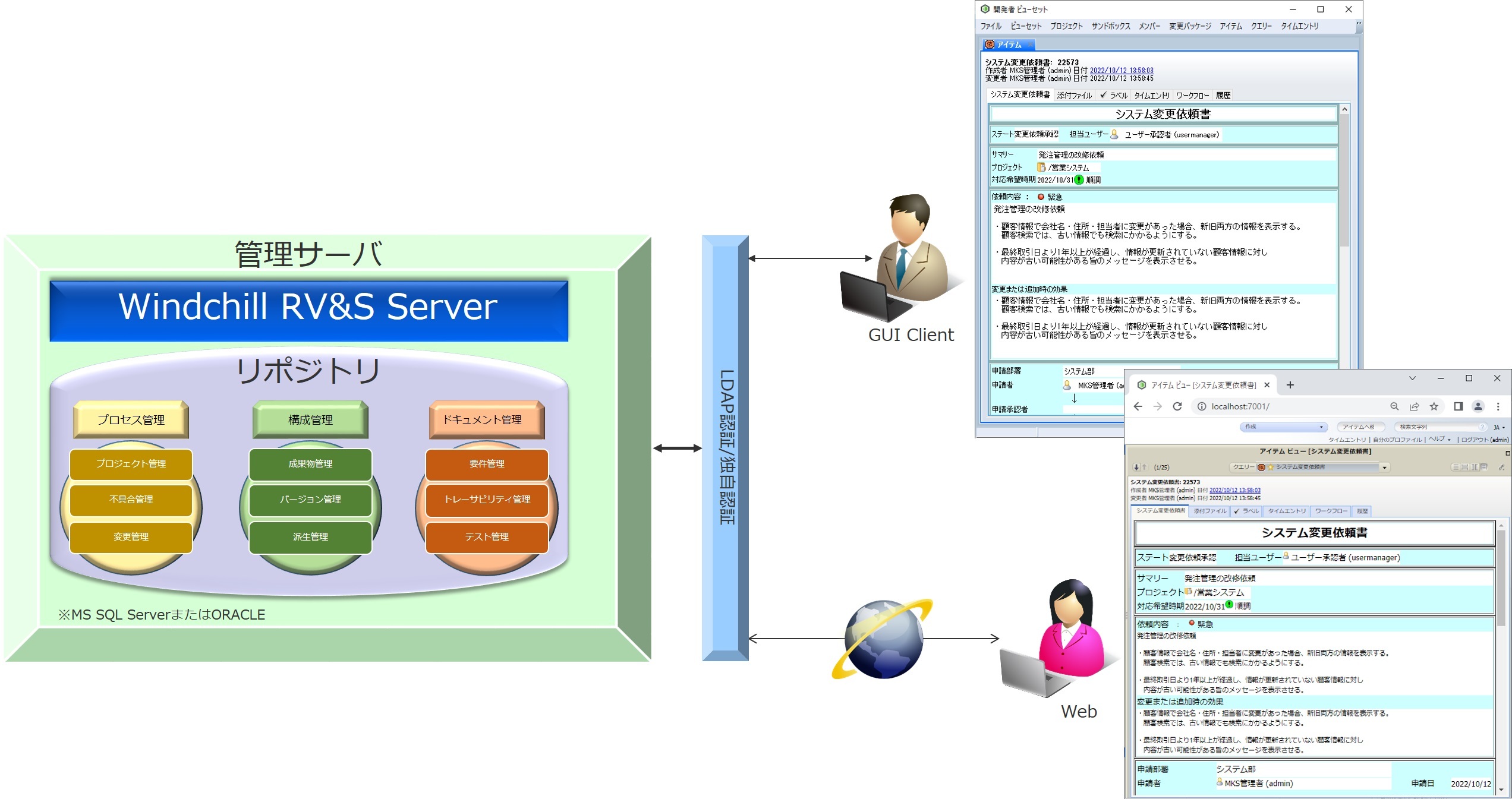Windchill RV&Sは、属人化しがちな管理を可視化して、タスクのつながりや、プログラムの関連付けなど、プロジェクト全体のトレースを図りながら開発プロセスの一元管理を実現するための開発工程管理統合ソリューションです。プロジェクト関係者がWindchill RV&Sを利用することで、開発から運用におけるすべての構成要素(要件、設計書、ソースコード 等)、管理要素(変更、課題、工数、コスト 等)、及び活動履歴を一元管理でき、標準化、可視化、共有を加速させます。