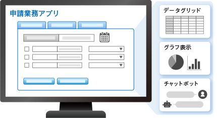 操作性の高いWebアプリケーション(Ajaxによる部分再描画、データ候補を表示するサジェスト機能、データ入力に伴う自動計算など)をローコードで開発することができます。さらに、データグリッド、グラフ表示、チャットボットといった多彩な機能を盛り込むことも可能です。