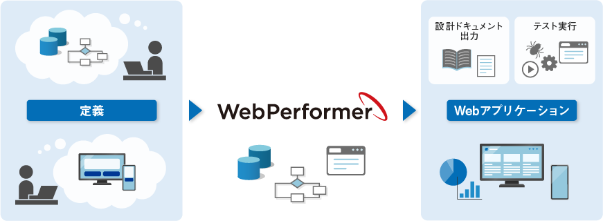 Javaの知識に関わらず、業務・設計ノウハウを活用して設計した情報をWebPerformerに定義(登録)し、「アプリケーション生成ボタン」をクリックするだけでWebアプリケーションを自動生成します。PCのみならず、スマートフォンやタブレット端末などのスマートデバイスに最適化されたWebアプリケーションも自動生成します。コーディングの自動化とそれによる品質の均一化により開発期間を短縮し、ローコード開発を実現します。