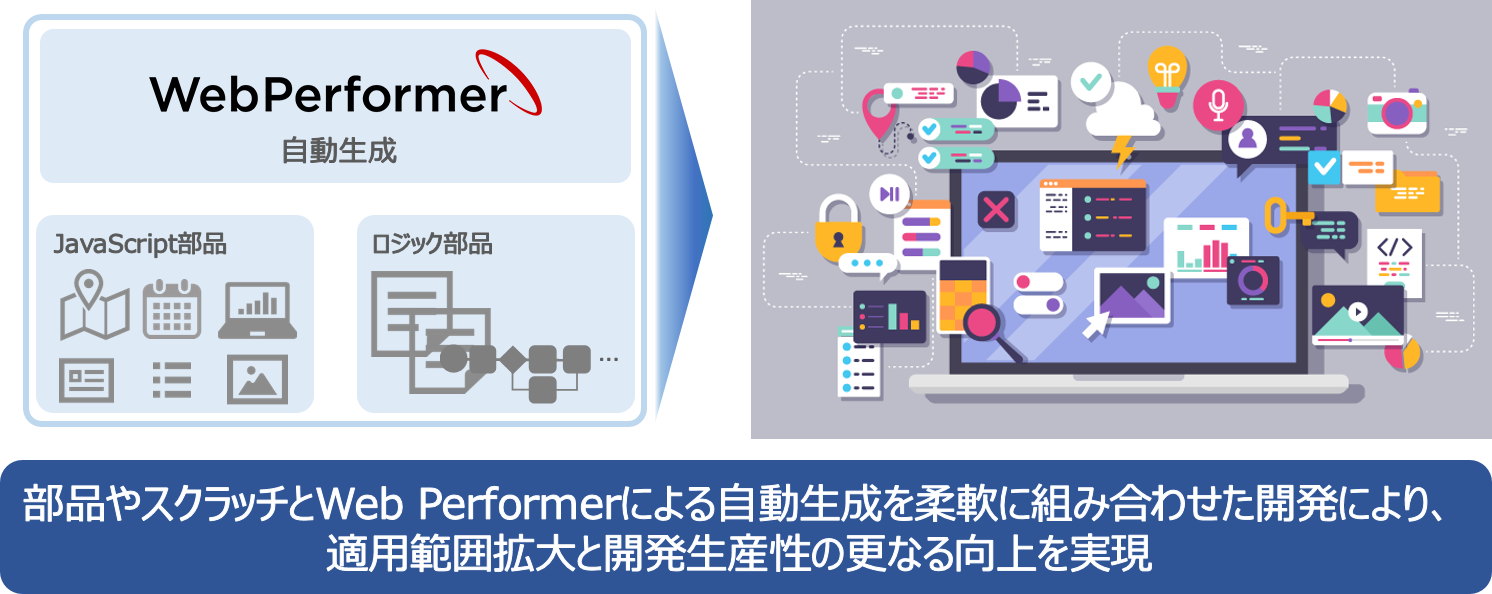 Web Components、React、既存のスクラッチ部品を柔軟に組み合わせた拡張開発が可能です。これにより、開発適用範囲を広げることができます。