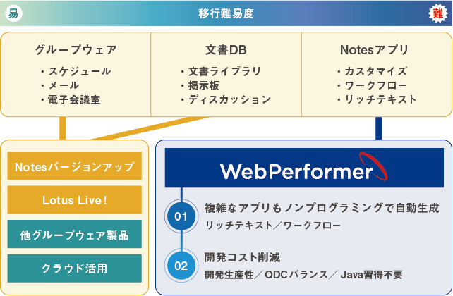 グループウェア機能群と文書DB機能群の上位バージョンへの移行は比較的容易と言えます。また、別なグループウェア機能製品に切り替えることも可能です。しかし、Notesアプリ機能群は上位互換の問題や、アプリケーションに独自の作り込みが行われているため、上位バージョンへの移行は難しいと言えます。移行時にNotesアプリ機能群を別アプリケーションとして再構築すると、追加要件が発生し、開発コストが増加したり、運用開始まで時間を要してしまうことも珍しくありません。