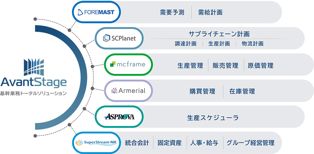 AvantStageは、キヤノンITソリューションズが提唱するBest of Breed型で基幹業務のソリューションを提供するコンセプトです。需要予測・需給計画の「FOREMAST」、生産管理・原価管理・販売物流の「mcframe」、生産スケジューラの「ASPROVA」、統合会計・人事/給与の「SuperStream-NX」を組み合わせて、お客さまの業務に合わせた最適なソリューションを提供、柔軟なシステムの構築、導入、運用ができます。