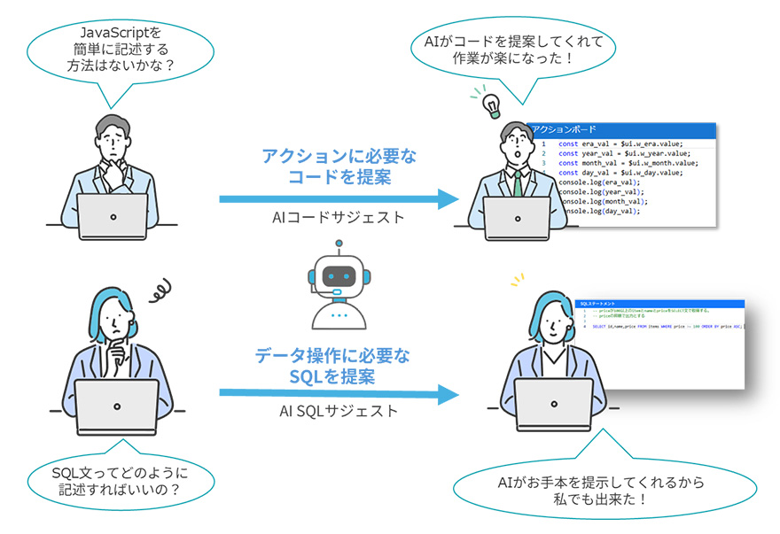 開発者が「やりたいこと」(命令)を日本語で記述すると、生成AIが提案したコード/SQL文を参考に開発ができるようになります。