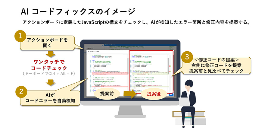生成AIが構文エラーを確認し、修正イメージを提案するので、プログラム実装の工程を効率化!