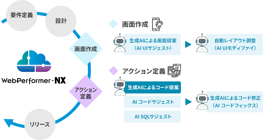 WebPerformer-NXでは、生成AIを活用した各種機能を提供しており、アプリケーションの「開発時」においても、「利用時」においても、さまざまな場面で生成AIをご活用いただけます。
