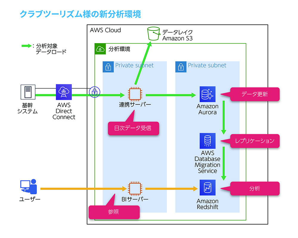 「AmazonAurora」に展開され、その後「AWS Database MigrationService」による変換処理を介してBIツールからの参照先データウエアハウスとなる「Amazon Redshift」に格納されます。このプロセスを日次のバッチ処理で実施し、分析対象データを最新のものにしています。