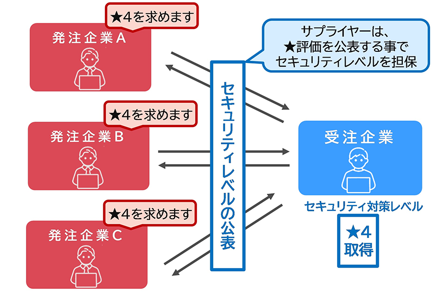 SCS評価制度(サプライチェーン強化に向けたセキュリティ対策評価制度)は、サプライチェーンにおける重要性を踏まえて、企業が満たすべきセキュリティ対策を★3〜★5の段階で示すことが想定されています。(出典1,2)。 ポイントは、取引の現場で使える“共通の物差し”を設け、過不足のないセキュリティ対策を判断しやすくすることにあります。制度構築方針(案)では、2社間の取引契約等で、発注側が委託先に適切な段階(★)を提示し、示された対策を促しつつ実施状況を確認する使われ方を想定しています(出典1)。
