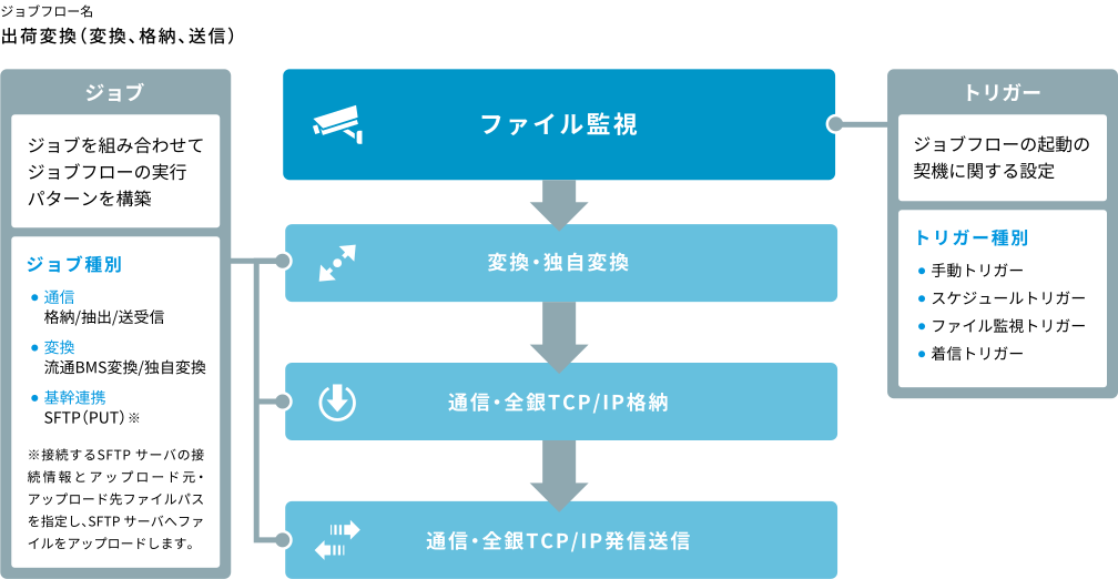 - 各サービス(通信・変換)による一連の処理を業務パターンとしてジョブフローに設定することで、業務を自動運用することができます。