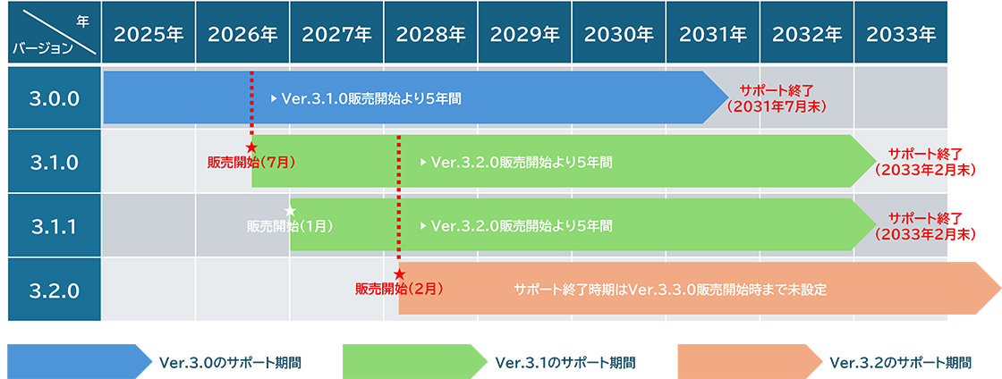 - 各バージョンの通常サポート期間(通常保守)は、原則マイナーバージョンを含めて1世代後のバージョンがリリースされてから3年後までとします。