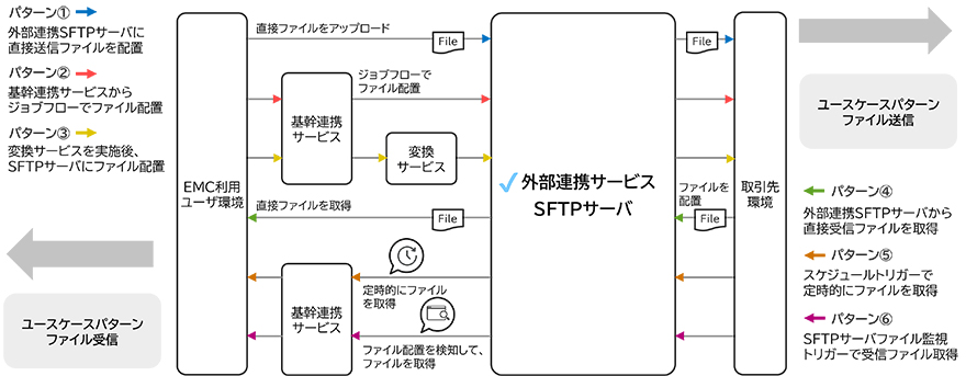 外部連携サービスSFTPサーバ機能は、ファイル送信と受信ファイル取得といった双方向のデータ連携に組み込むことができます。