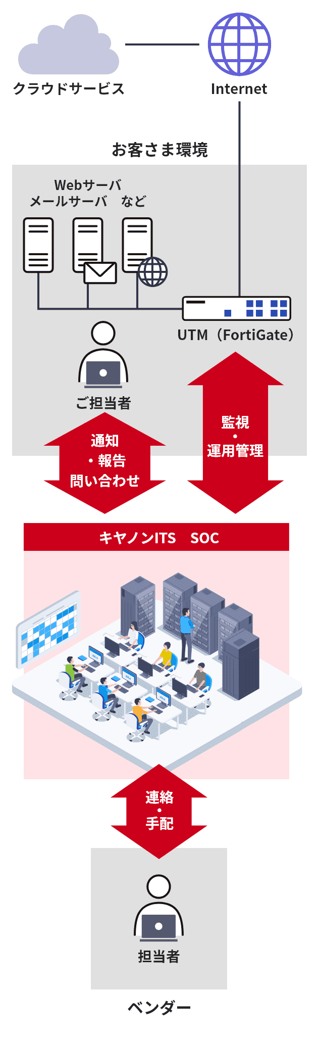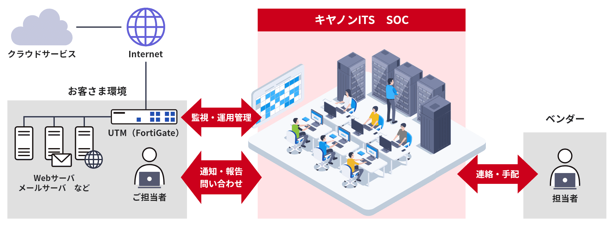 キヤノンITソリューションズの「UTMセキュリティ運用支援サービス」は、お客さまが導入されているフォーティネット社のUTM「FortiGate」シリーズを対象としたSOCサービスです。豊富な経験と高度な知見を持つセキュリティ専門家から構成される体制で、お客さま機器の監視と運用を代行し、万全のセキュリティ対策をご支援します。