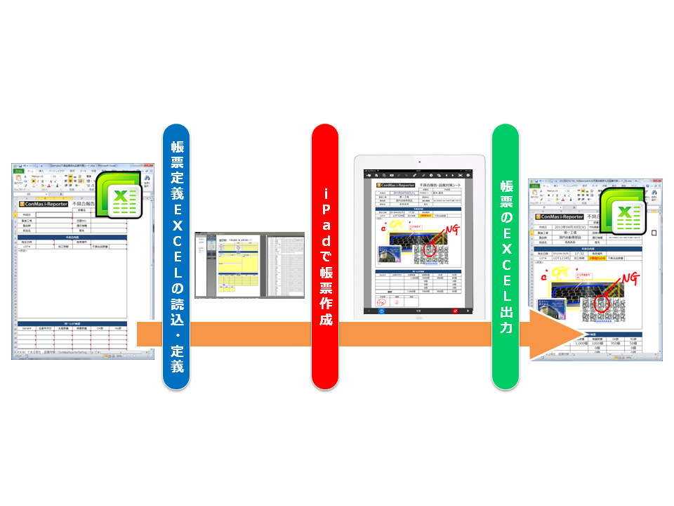 - 現場担当者が、日頃使い慣れたExcel帳票を活用して簡単にiPadの入力画面を設計