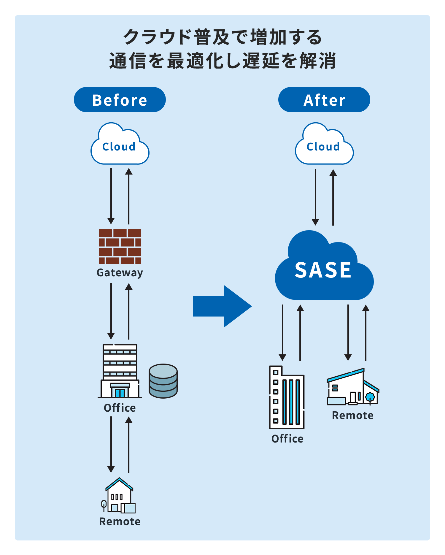 SASEは、通信をデータセンターなどに集約せず、各拠点から直接安全にインターネットへ接続する仕組みを提供します。これにより通信経路が最適化され、遅延や回線逼迫の問題を解消できます。