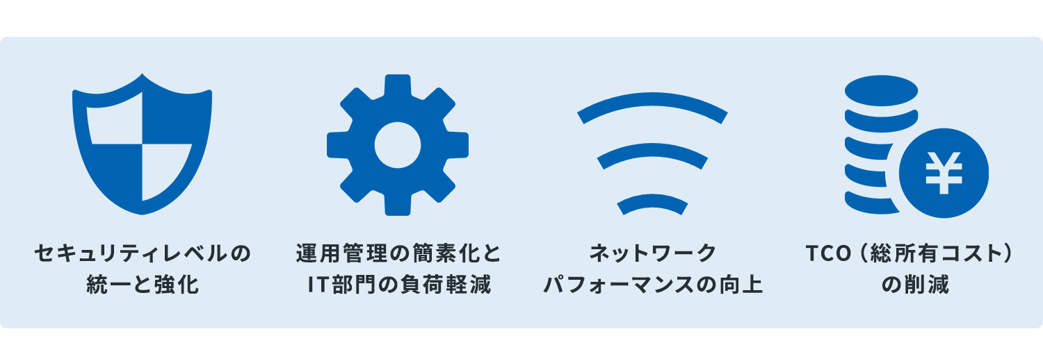 従来は個別に導入・運用されてきたネットワーク機能とセキュリティ機能をクラウド上で統合することで、ユーザーやデバイスがどこにあっても、一貫したポリシーに基づく安全なアクセス環境を提供することを目的とします。